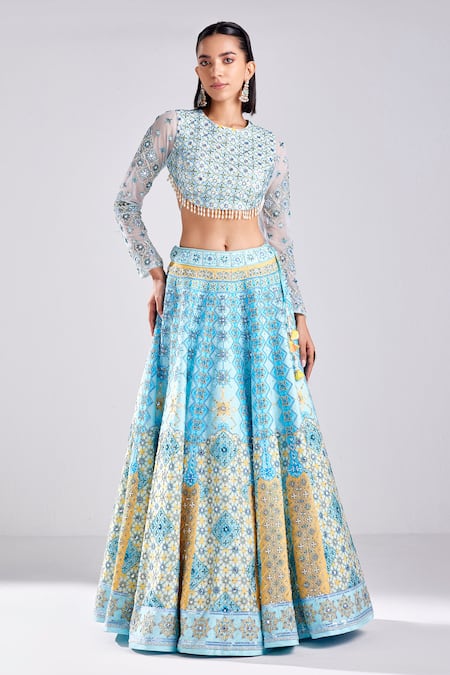 Blue Silk, Tulle Beads, Pearls Round Neck Embroidered Lehenga Set