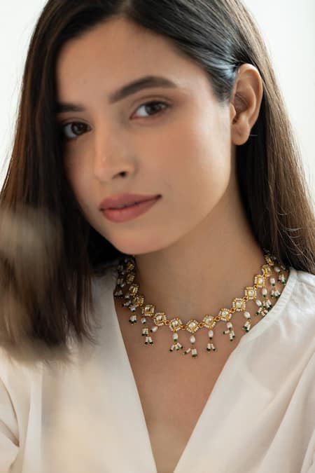 Gold Plated Kundan And Pearl Embellished Necklace