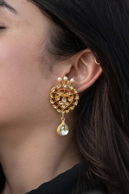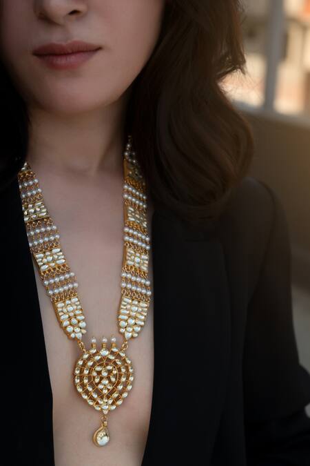 22k gold plated, silver alloy necklace studded with kundan and pearl details. Comes with matching earrings.