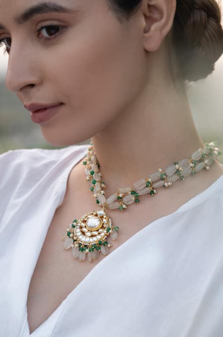 Green kundan and natural stone embellished pendant necklace featuring a half crescent carved design