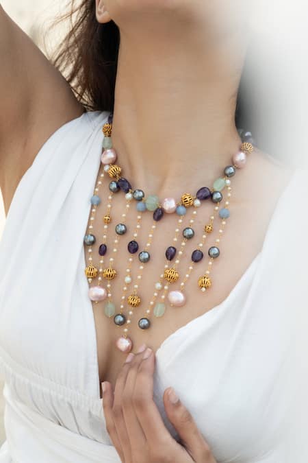 Multi-color choker necklace featuring shell pearls, natural stones, and fluorite stones