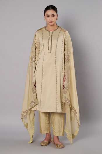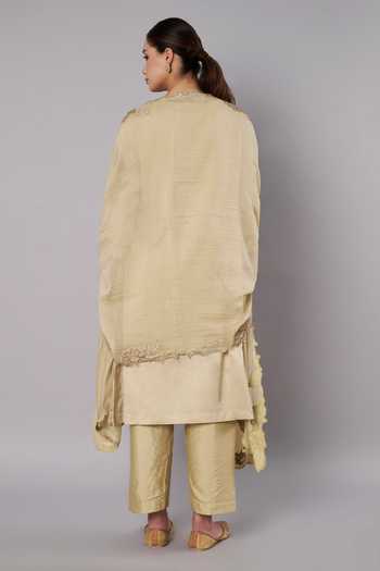 Green kurta set featuring delicate appliqu e9 floral embroidery with bugle bead work on the kurta and dupatta, adding soft texture and subtle shimmer. Paired with straight pants and a lightweight embroidered dupatta for a graceful festive look.