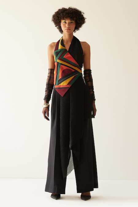 Black Crepe, Crinckled Georgette Geometric V Neck Draped Jacket And Trouser Set