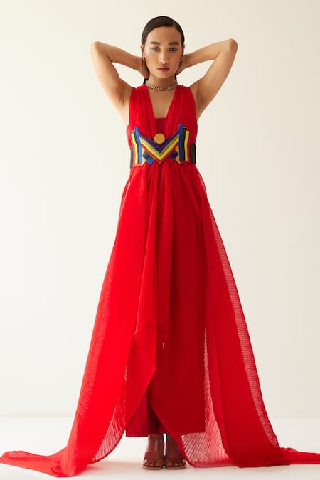 Buy_Mini Sondhi_Red Crepe, Crinckled Georgette Abstract, Aari, Bead Draped Jacket And Trouser Set_Online_at_Aza_Fashions