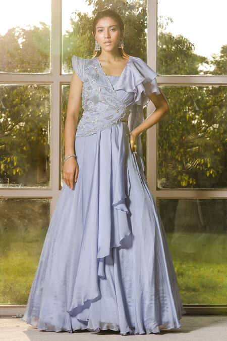 Periwinkle pre-stitched draped lehenga saree in chiffon & organza base. Paired with a bustier & embroidered half jacket with corded power shoulders.