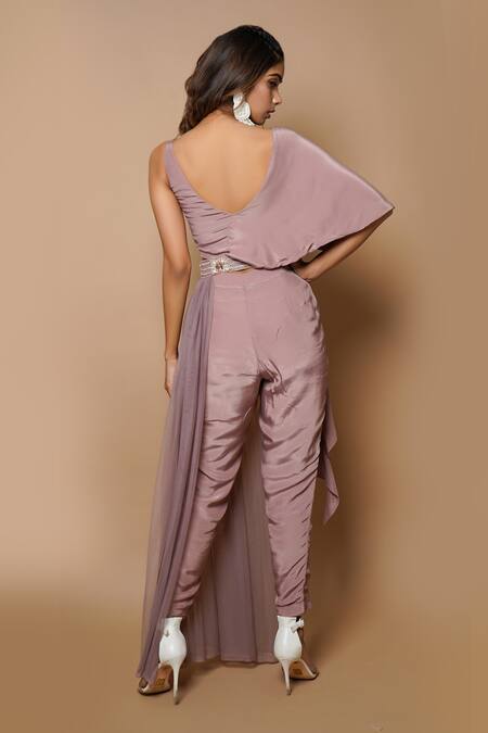 Onion pink top with drape on one side and one side flared sleeve. Comes with straight pants and embroidered belt.
