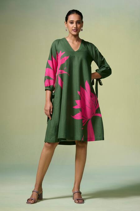 Green Cotton, Linen V-neck Dark Floral Print Midi Dress
