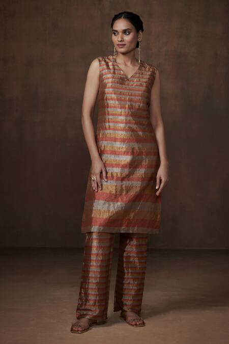 Buy_Dressfolk_Gold Tissue V-neck Metallic Stripe Kurta Set