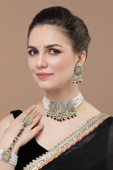 Gold toned choker necklace featuring white kundan, pearls, and purple & green natural stones. Paired with a matching set of earrings for a complete look.