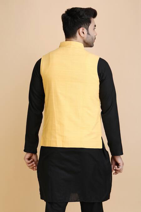 Yellow bundi featuring tribal woven patterns and a mandarin collar