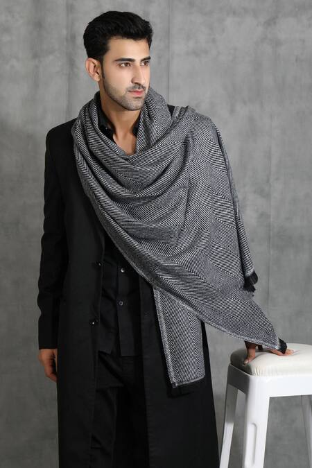 Grey handwoven cashmere fine wool shawl with chevron patterns.
