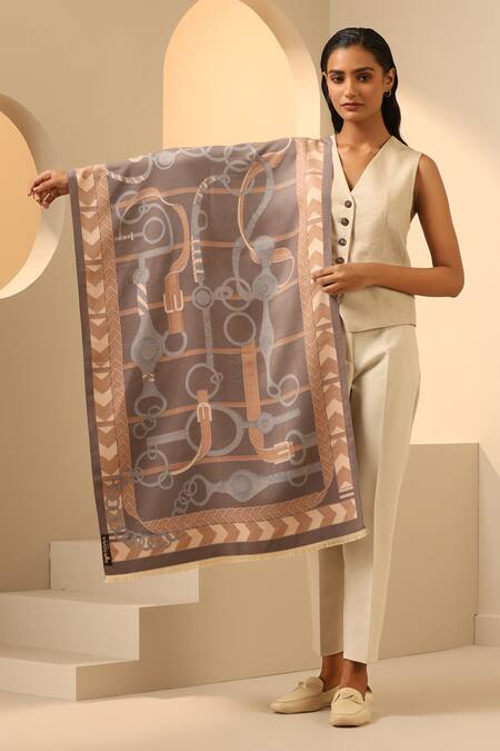 Cream and light grey reversible stole featuring abstract jacquard woven motifs and a fringe tassel border