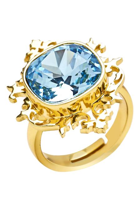 Desired by everyone, this gold hued ring flaunts a grand aquamarine crystal. The intricate design crafted around the square crystal adds poise.