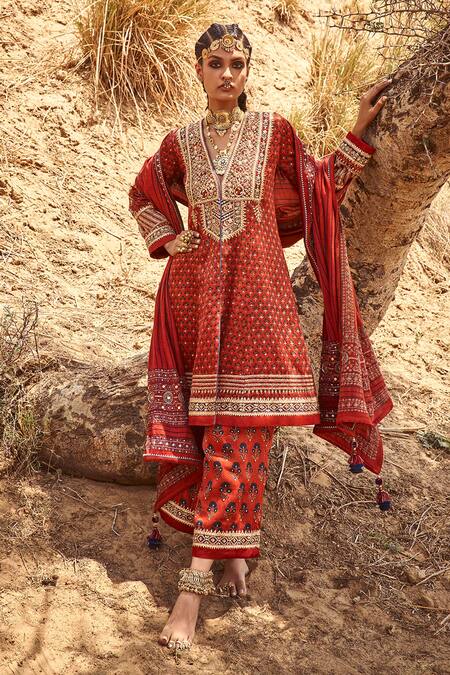 This red ekaa ajrakh kurta set is a sustainable celebration-wear of complementing patterns and hand-block prints acquired through vegetable dyes. The look is enhanced with gota patti hand embroidery along with dori, sequins and zardozi embellishments.