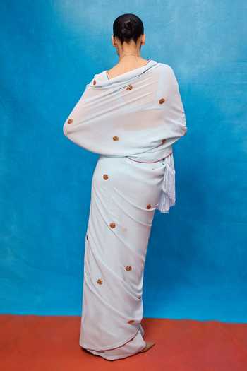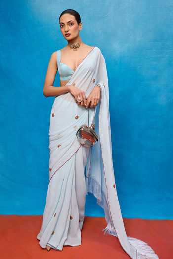 Sky Blue georgette saree with delicate embroidered motifs. Paired with a running blouse piece
