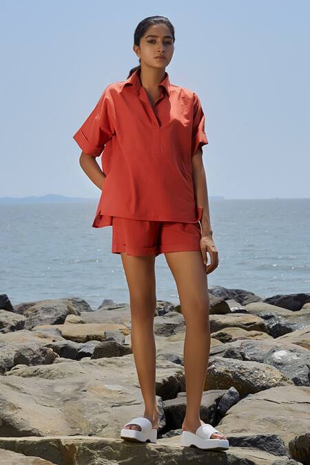 Rust plain cotton shirt featuring a collared neck and half sleeves
