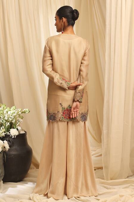 Beige jacket featuring floral embroidery and a front opening. Paired with a matching sharara and inner.