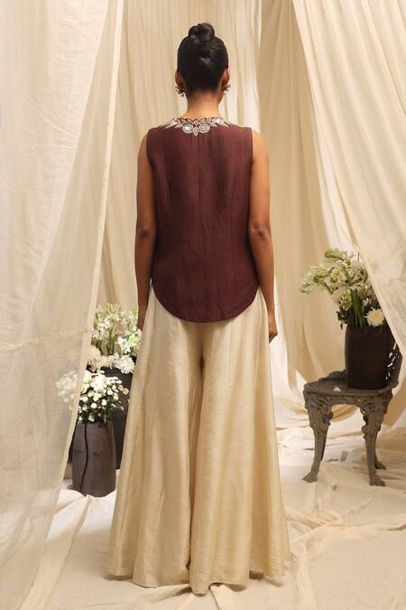 Ivory and brown waistcoat featuring intricate floral embroidery. Paired with a matching sharara made from linen satin and taffeta.