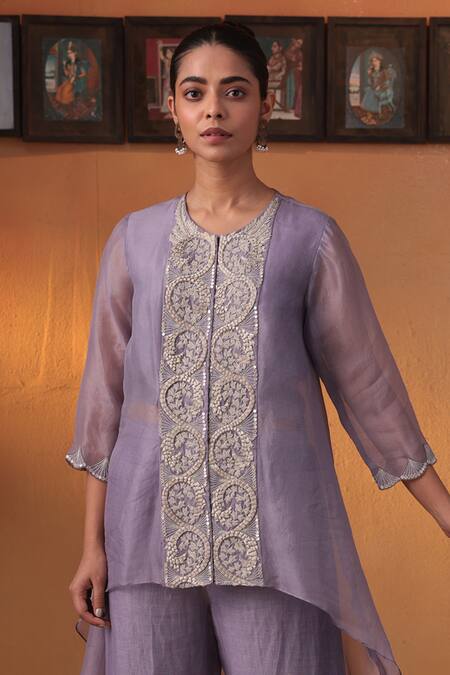 Lavender top in organza featuring intricate embroidery. Paired with matching lavender linen satin pants.