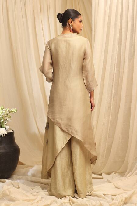 Oyster beige jacket featuring intricate floral embroidery and an asymmetrical hem. Paired with coordinating wide-leg pants in a linen satin blend.
