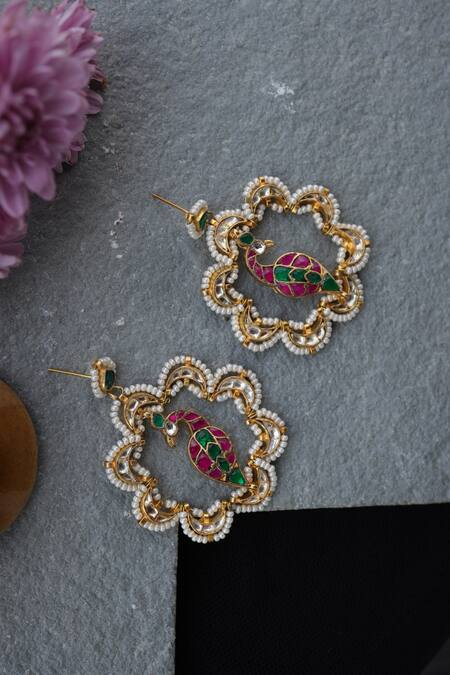 Gold Plated Kundan, Seed Pearls Peacock Earrings