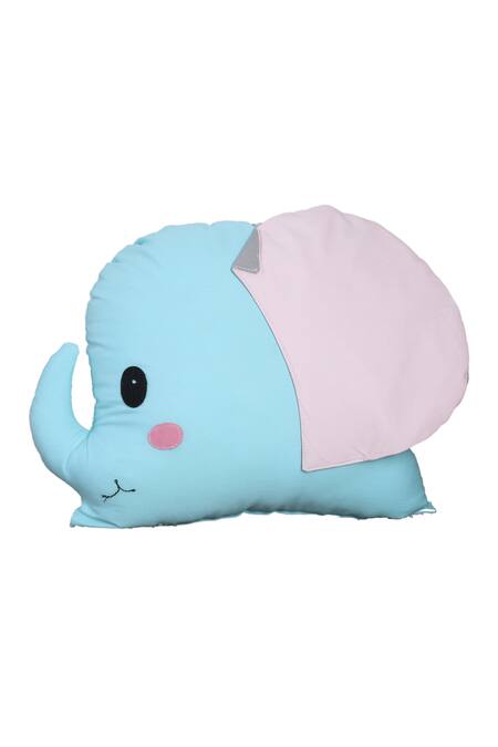 Sea green elephant shape cushion with contrast ear attached, felt face detailing and a trunk.