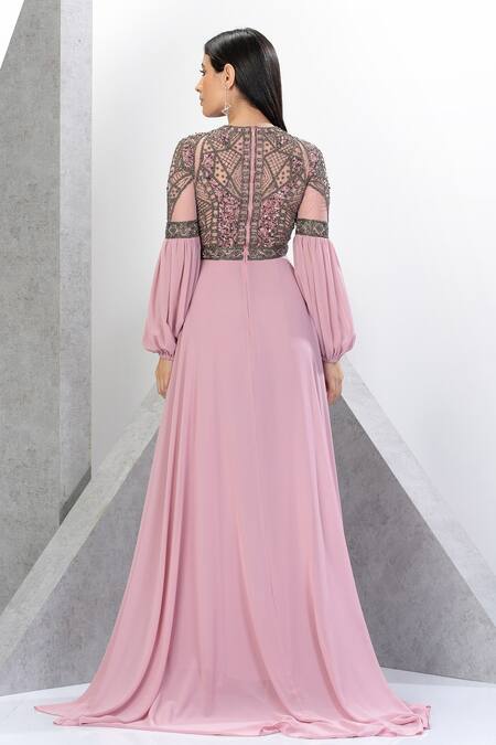 Pink Net, Chiffon Beads, Sequins Plunge Neck Sleeve Embroidered Gown