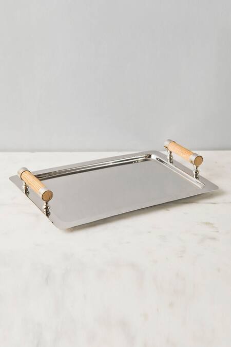 Silver rectangular-shaped tray with striped wooden handles on the side.