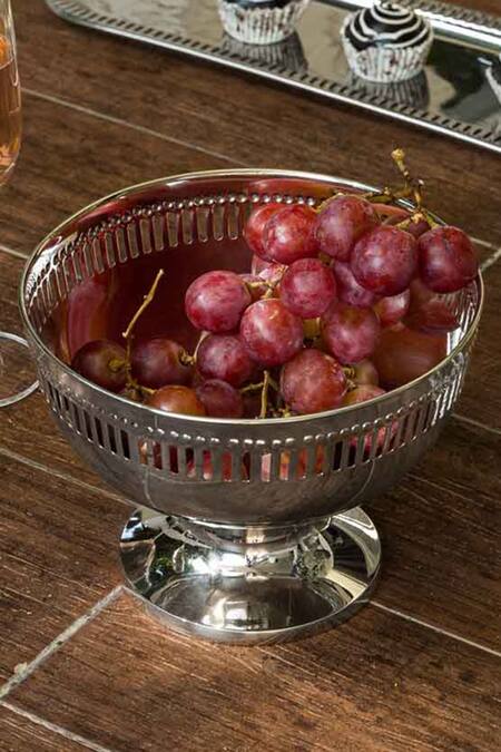 Nickel Victorian fruit bowl with laser etched cutwork details, made from brass.
