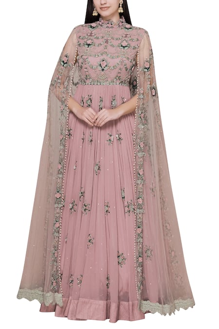 Pink anarkali style gown with all over 3D floral motif work & attached cape.