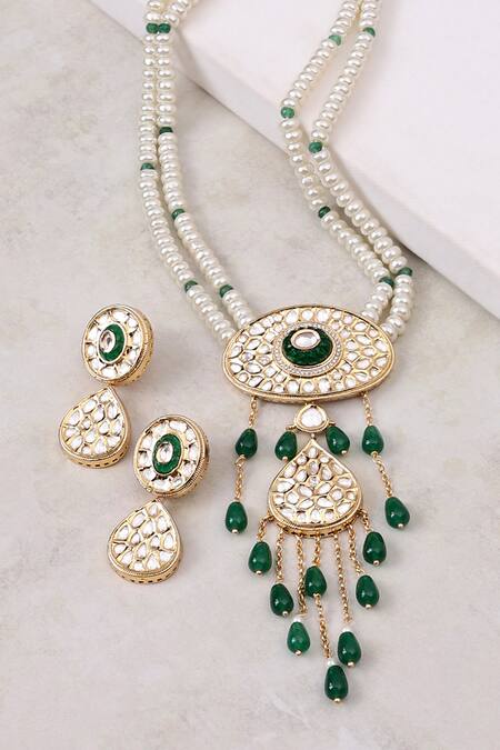 Gold finish handcrafted necklace with polkis, green drops in a gold finish long pendant and pearl beads. Comes with earrings.