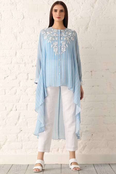 Aqua blue asymmetric tunic with all over geometric print & placement floral motif embroidery. Comes with inner slip.