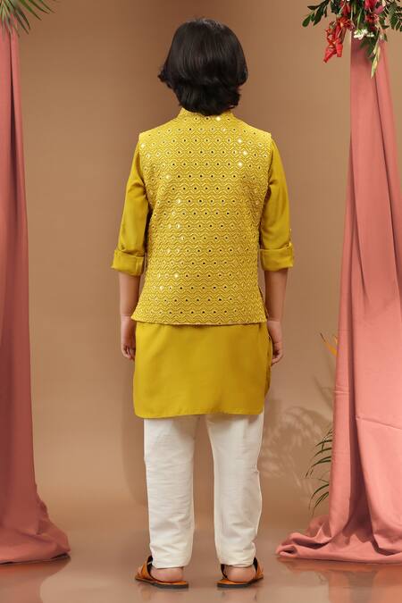 Mustard yellow silk bundi featuring a mandarin collar with geometric pattern thread, mirror, and sequin embellishments. Paired with a pathani kurta with a shirt collar and flap patch pockets, along with cream straight-fit pants.