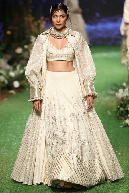 Ivory flared lehenga with floral motif embellished all over. Paired with V-neck blouse.