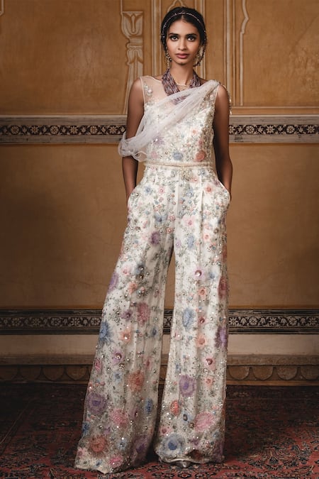 Ivory jumpsuit with all-over floral motif work. Comes with embellished drape.