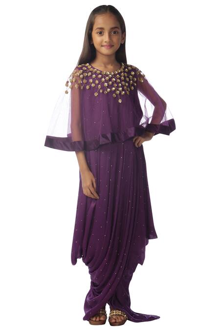 Purple draped dress featuring an overlay with embellished floral motifs on a cape