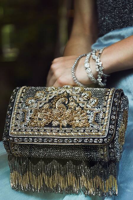 Black clutch with all over luminous Japanese micro bead and glass crystal work