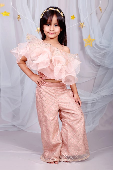 Peach Silk, Organza, Net Sequins Embellished Flared Pant Set