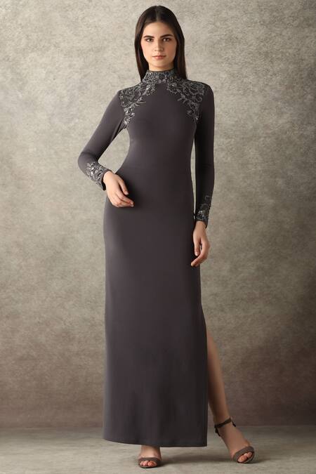Grey gown with placement sequin work & thigh-high side slit.