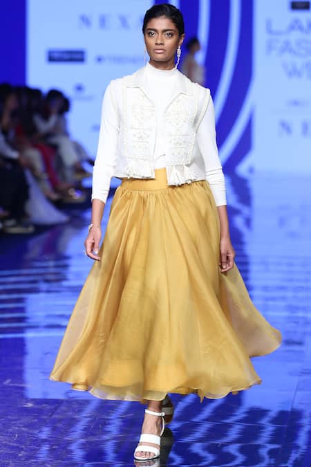 Ivory jacket with embellsihed detail all over paired with flared skirt.