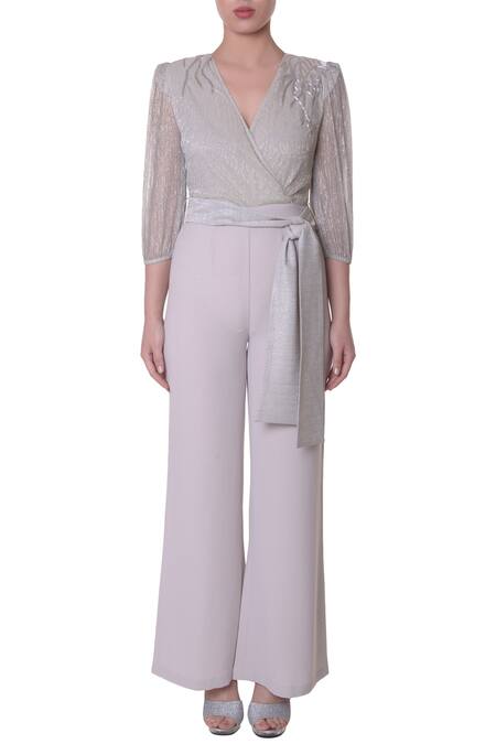 Grey jumpsuit with embellished shoulder detail & paired with belt.