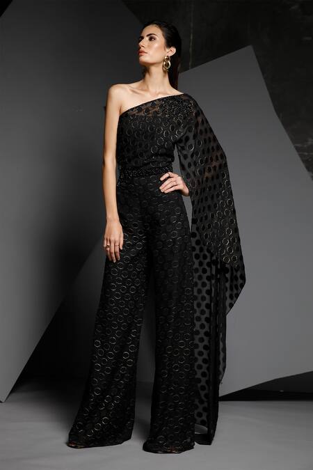Black jumpsuit with embellished motifs.