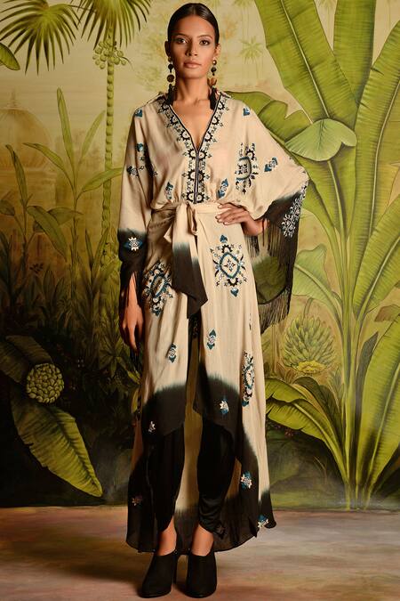 Beige kimono wrap with floral embellished detail & fringe detail.