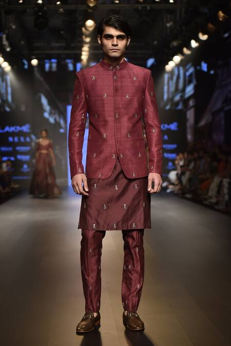 A traditional silhouette is this dark purple silk kurta set for an upcoming festive occasion. It features embellishment on the ombre kurta.