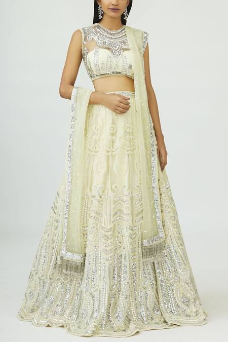 Off-white lehenga with all-over sequin work. Comes with embellished blouse & bead tassel border dupatta.