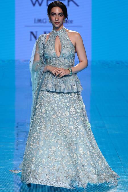 Blue peplum-blouse with cutout detail, halter neck & all-over floral motif work. Comes with embroidered lehenga & lace trim border dupatta.