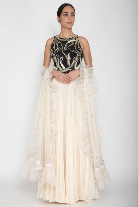 Black blouse with sequin embellishments & 3D motifs. Comes with flared ivory lehenga & net dupatta.