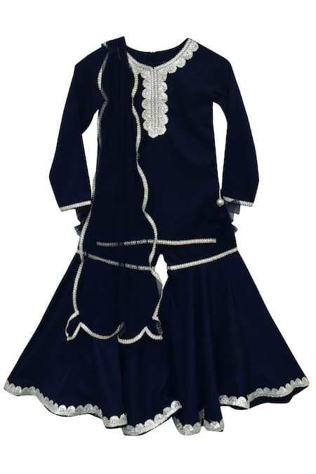 Blue kurta featuring a round neckline and full sleeves with a back zip closure. Paired with a matching sharara adorned with side tassel details and a coordinating dupatta.