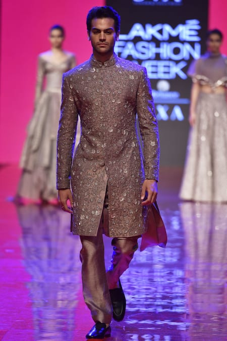 Grey sherwani with floral embellishment. Comes with straight silk pants.