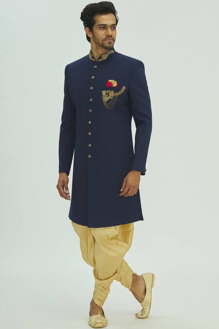 Blue sherwani with zardozi embellished floral motifs & welt pocket. Comes with gold dhoti pants.